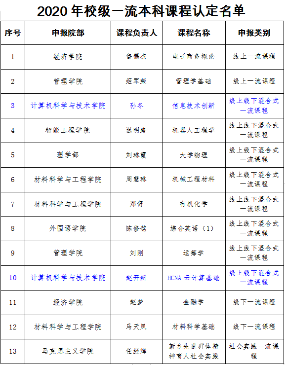 其中,我院的《信息技术创新》、《HCNA云计算基础》两门课程被认定为2020年线上线下混合式一流课程。加上2019年的《信息处理技术》、《计算机网络A》两门认定的校级一流课程,2020年的省级一流课程——《信息处理技术》,我院目前共认定1门省级一流课程和4门校级一流课程。