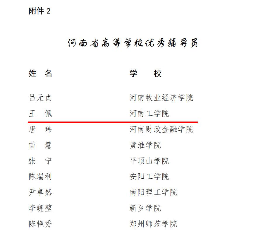 根据《河南省教育厅办公室关于开展全省高校思想政治工作奖评选的通知》(教办思政〔2022〕28号)要求,经各高校推荐、专家评审、综合评议等环节,评选出“河南省高等学校思想政治工作先进个人”123人、“河南省高等学校优秀辅导员”141人、“河南省高等学校优秀思想政治理论课教师”82人、“河南省高等学校优秀心理健康教育工作者”115人。其中我院王佩老师获得河南省高等学校优秀辅导员荣誉称号。