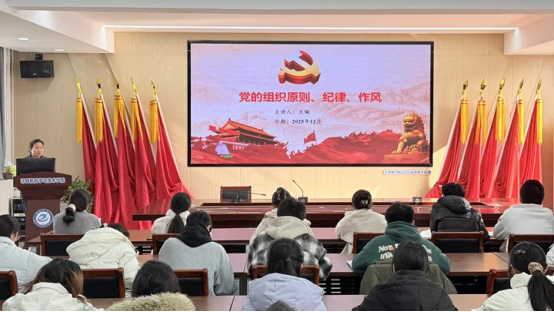 为深化入党积极分子对党的组织原则、纪律和作风的理解,切实提升政治素养,筑牢思想根基,12月9日中午1点,我院党委学生党支部于教学三号楼411会议室开展了以《党的组织原则、纪律、作风》为主题的专题党课。本次党课由学生第三党支部书记王佩讲授,2025年下半年入党积极分子参加。