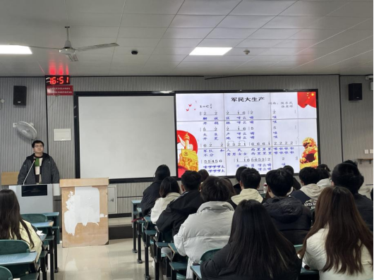 学唱完毕,王老师引导同学们从歌曲中感悟党史与党的精神。他指出,《军民大生产》生动再现了边区军民开荒种地、纺纱织布的劳动场景,传递出自力更生、艰苦奋斗的精神,既是大生产运动的“战歌”,也让延安精神得以传播发扬。他勉励同学们深刻领悟延安精神内涵并学以致用,新时代青年学生需坚守正确政治方向、紧跟党的步伐,践行新发展理念,学好马克思主义与科学文化知识,争做优秀的共产主义事业接班人。