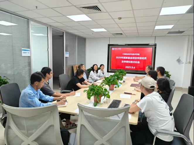 2025年9月4日,计算机科学与技术学院在会议室召开“2026年国家基金项目申报动员及申硕任务讨论会”,由副院长王鲜芳主持,院长马绍惠、副院长朱命冬出席,全院博士教师参加了会议。