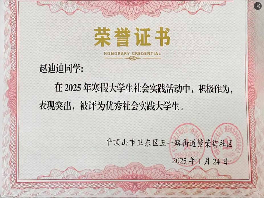 【荣誉榜-乡级】我院学生赵迪迪被评为平顶山市卫东区五一路街道繁荣街社区优秀社会实践大学生